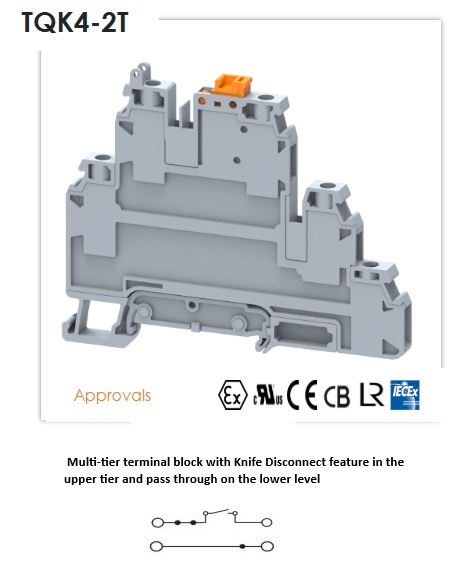 TQK4-2T Muti-Tier Terminal block – disconnect switch in top level and a pass-through terminal on the bottom level TQK4-2T_spec sheetDownload
